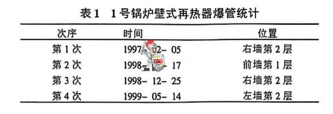 从1995年2月~1999年5月机组累计运行时间为 19 615 h,启停次数累计为100次,锅炉运行中共发生了10次爆管,其中壁式再热器占了40%。从统计情况看,壁再爆管次数呈逐年增多的趋势,爆管位置均集中在管子位移比较大的顶部第1、2层活动节点(见表1)。