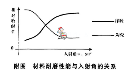 陶瓷的耐磨性能不仅与其硬度有关,而且与其受力方式、工作工况有关。在冲刷损工况下,材料耐磨性能和介质冲刷方向与材料表面的夹角有关。陶瓷材料与橡胶材料的耐磨性能随夹角的变化规律见附图。